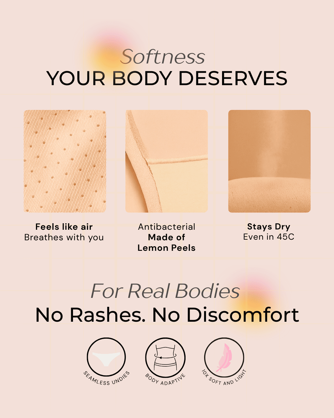 🚫 Seam-free, elastic-free comfort No edges pressing into skin, no seams rubbing the bikini line. Just smooth contact that moves exactly as your body does.